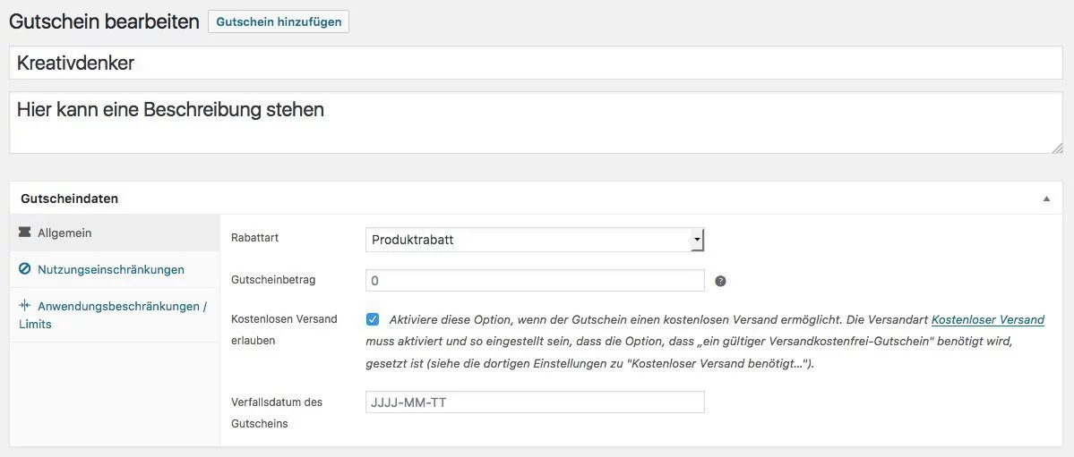 Optional kann darüber hinaus ein Verfallsdatum für den Gutschein festgelegt werden, um eine etwaige Aktion zeitlich zu begrenzen.