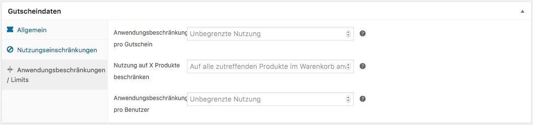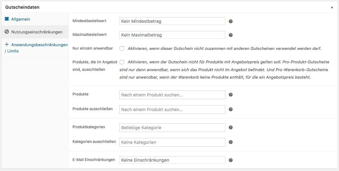 Der letzte Reiter „Anwendungsbeschränkungen / Limits“ bietet noch einige zusätzliche Optionen, um die WooCommerce Gutscheine zu limitieren, um Missbrauch vorzubeugen oder unerwünschte Verwendungen der Gutscheine zu vermeiden.