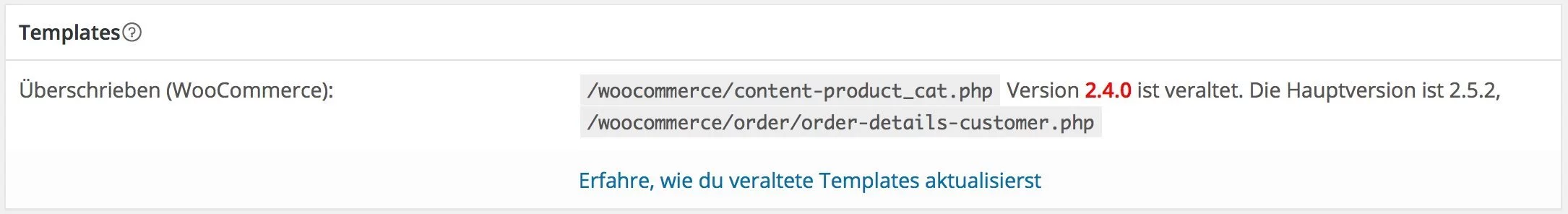 Da jedes Update von WooCommerce die durchgeführten Anpassungen überschreiben würden, gibt es die Möglichkeit, die modifizierten Template-Dateien zu duplizieren und in einem eigens dafür angelegten Ordner im gegenwärtig verwendeten Theme abzulegen. Die eigenen Änderungen können damit zwar durch Updates nicht mehr verloren gehen, etwaige Neuerungen oder Veränderungen halten somit jedoch auch keinen Einzug mehr in die Shop-Darstellung. Als Folge dessen, bemängelt WooCommerce etwaige veraltete Templates im Backend, sollten Differenzen in Bezug auf die verwendeten Template-Versionen festgestellt werden.