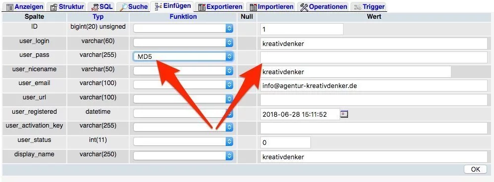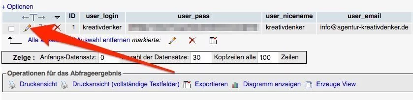 Sollten die bisherigen Lösungsversuche nicht zum gewünschten Erfolg geführt haben, so gibt es noch die Möglichkeit das Administrator-Passwort über die WordPress-Datenbank zurückzusetzen. Dazu ist Zugriff auf die MySQL Datenbank erforderlich. In der Regel stellen Webhosting-Provider dazu das Datenbankverwaltungstool phpMyAdmin zur Verfügung. Dies kann je nach Webseitenprovider variieren. Wer mit phpMyAdmin bzw. generell Datenbanken nicht vertraut ist, sollte sich bei diesem Schritt an einen Experten wenden. In jedem Fall empfiehlt es sich, im Vorfeld ein vollständiges Datenbank-Backup zu erstellen.