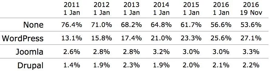 WordPress ist das erfolgreichste CMS der Welt. Daran besteht bereits seit einigen Jahren kein Zweifel mehr — das rasante Wachstum untermauert diese Tatsache. Noch im Januar 2011 konnte WordPress gerade einmal rund 13 Prozent Marktanteil einstreichen, inzwischen bewegt man sich steil auf die magische 30 Prozentmarke zu. Direkte Konkurrenten wie etwa Joomla oder Drupal kommen mit 3,3 und 2,2 Prozent zusammen gerade einmal auf knapp über fünf Prozent Marktanteil und sind damit weit abgeschlagen.